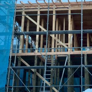 現場ではまず、「外部先行足場組」を行いました。