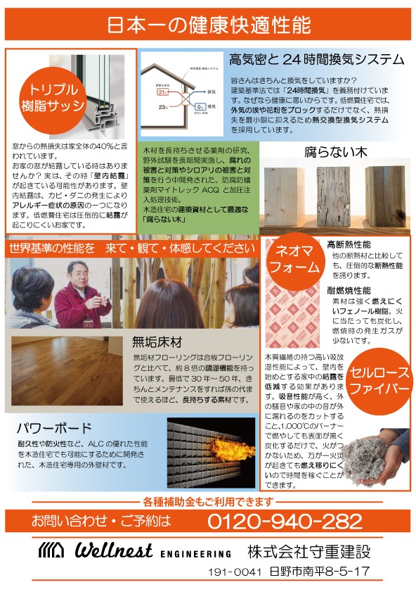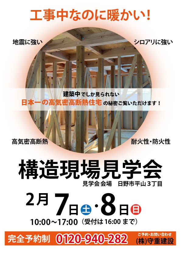 event 構造現場見学会開催します! 建築途中の高気密高断熱住宅の見学会を開催いたします。 建てている途中でも暖かい、日本一の高気密高断熱住宅の秘密をご覧いただけます。 日時:2月7日(土)・8日(日)10:00~17:00(受付は16:00まで) 会場:日野市平山3丁目(詳しい住所はご予約時にお伝えいたします) 完全予約制ですので、ご予約をお願いいたします。 お問い合わせ・ご予約は 0120-940-282 までお願いいたします。 前の記事 一覧へ戻る